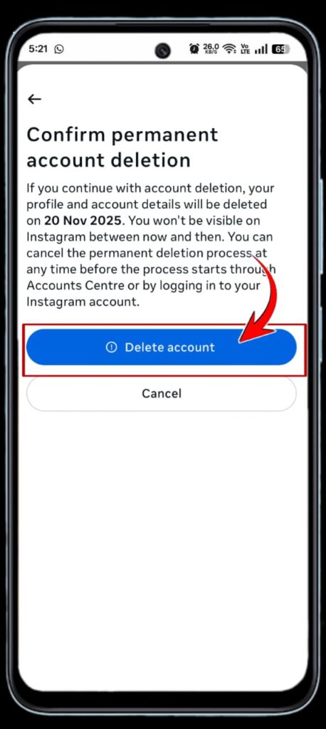 दोस्तों अब आप जैसे ही Delete Account के बटन पर क्लिक करते हैं तो आपका Instagram account permanently delete हो जाएगा। बस आपको ध्यान में एक बात रखनी है आने वाले 30 दिनों तक आप अपने Instagram Account को कहीं पर भी लोगों ना करें, यदि आप कहीं पर भी लोगों करते हैं तो आपका Instagram account delete नहीं होगा।