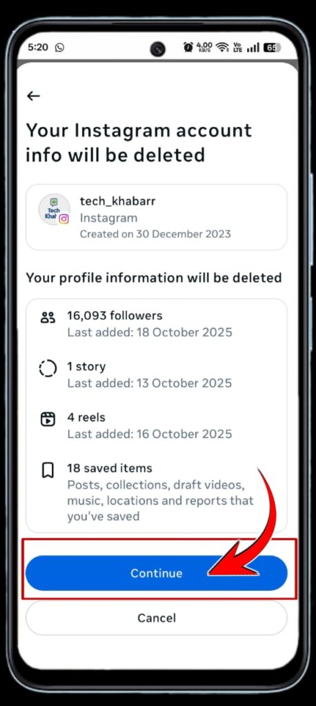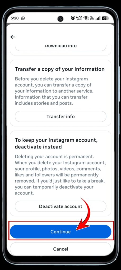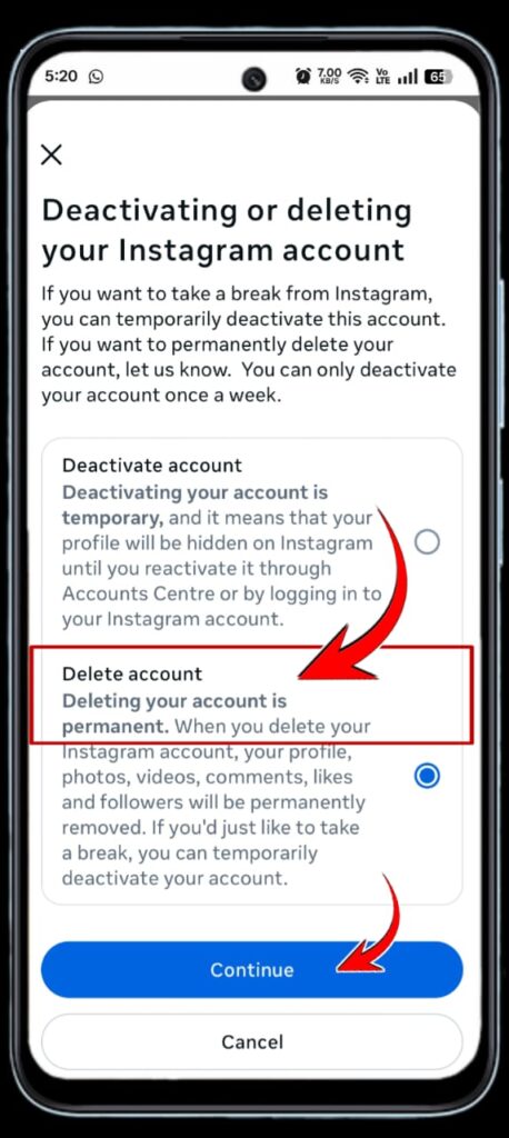 अब यहां पर आपको 2 ऑप्शन नजर आएंगे, यदि आपके Account Deactivate करना है तो फर्स्ट ऑप्शन को सेलेक्ट करें, Parmanently Delete करने के लिए डिलीट अकाउंट को सेलेक्ट करें और Continue करें।