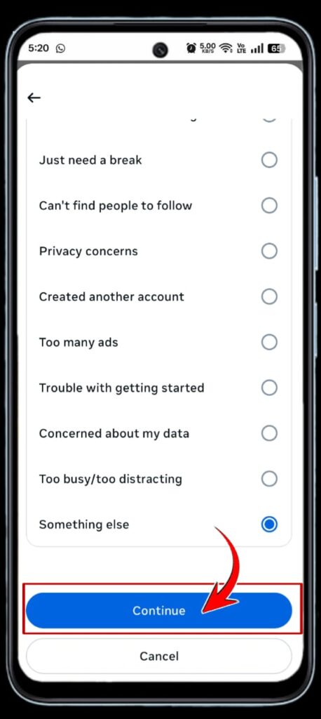 इसके बाद नेक्स्ट पेज के अंदर अपना कोई भी एक Reason सेलेक्ट करें और Continue करें।