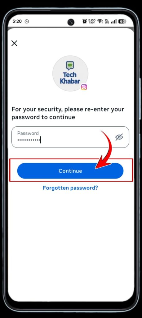अब आपको अपने Instagram Account के Password को यहां डालकर Continue बटन पर क्लिक करना है।
