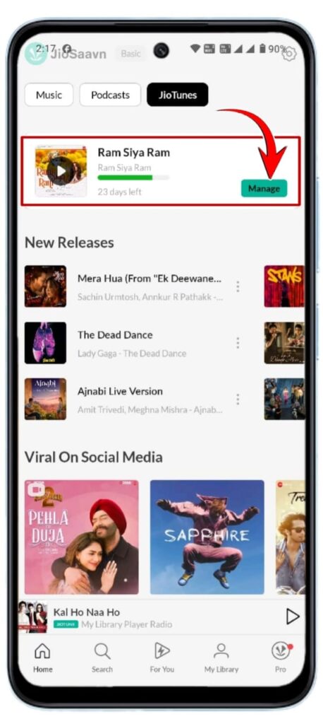 फिर नीचे की तरफ जाकर जो Caller Tune अपने लगाई है उसके सामने Manage के ऑप्शन पर क्लिक करना है।